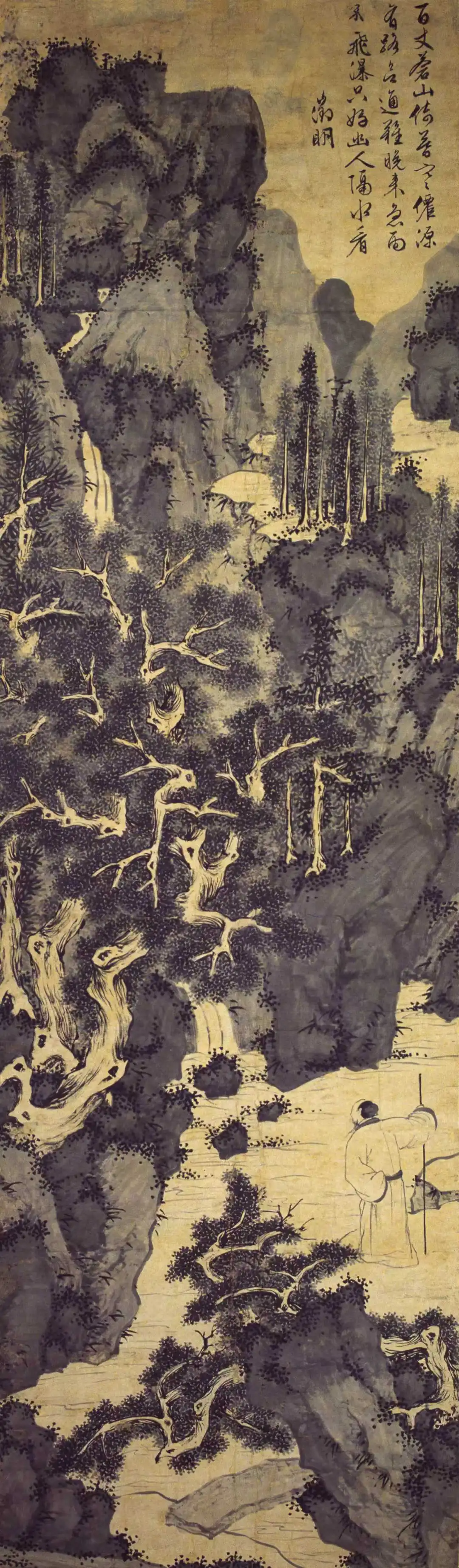此作承袭沈周一路粗笔山水技法,而又有所创新:画家简化皴法,以水墨浓淡变化表现山体远近层次与古木森郁之态,以虬劲如龙之线条写树干,复以厚重用墨营造古朴幽深的文人意境。作品尺幅宏大、构图饱满,大面积浓墨的运用极具视觉冲击力。这类风格在文徵明作品中并不多见,是研究其粗笔山水面貌与艺术多样性的重要实物。