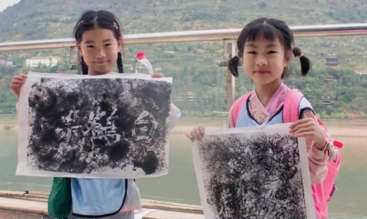 孩子们在专业导师指导下,体验铺纸、喷湿、捶打、上墨等拓印步骤,拓印白鹤梁“水纹石鱼”或名人题刻。