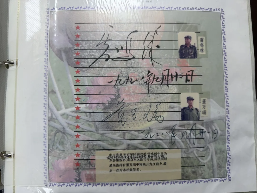 影集中,一张董万瑞将军抱着孩子的照片,是漆爱勇同志最珍视的珍藏。“董将军平时带兵特别严厉,但抱着孩子时的眼神,满是慈祥,这就是最真切的军民情啊。”而影集中雷鸣球、董万瑞将军的亲笔签名照,更是意义非凡,其中一张更是董万瑞将军在九江签下的最后一次名字。漆爱勇同志回忆起当时挤着找将军签名的场景,仍历历在目,直言“这是一辈子的纪念”。