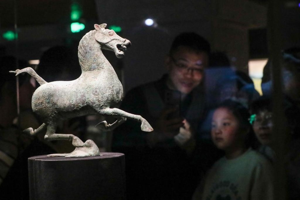 在甘肃省博物馆二楼丝绸之路文明展厅,观众观看铜奔马(复制品)