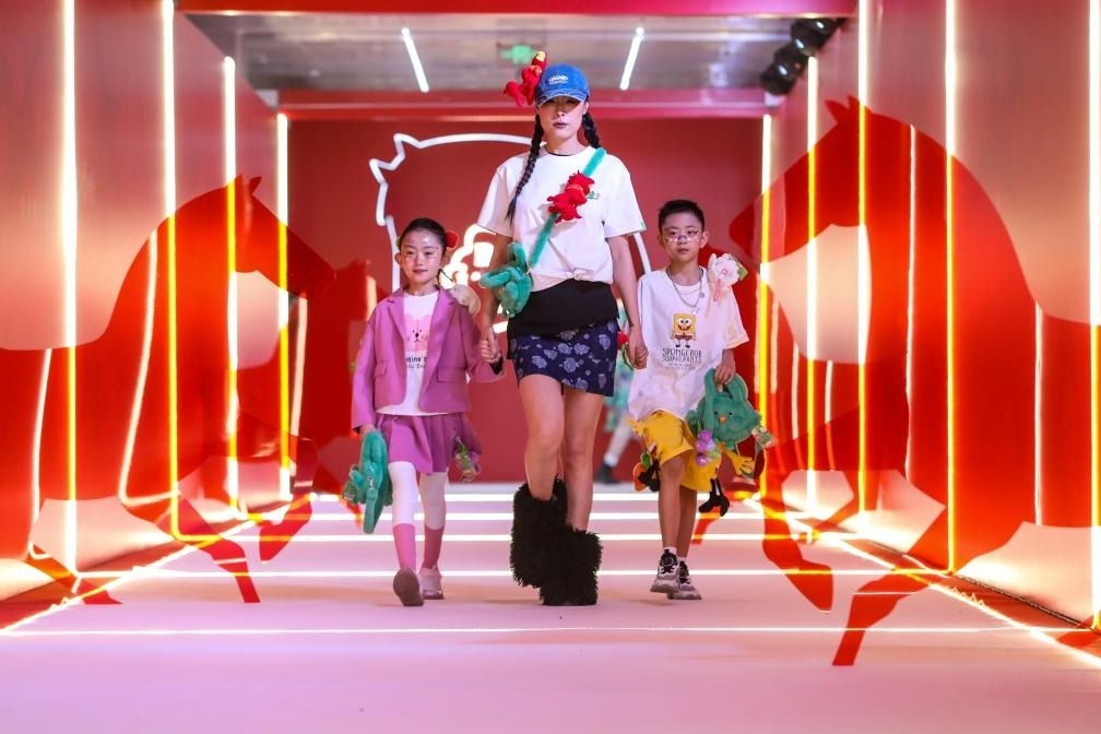 在甘肃省博物馆一楼大厅,模特(中)佩戴新款马踏飞燕贺岁毛绒玩偶“红运当头马”走秀