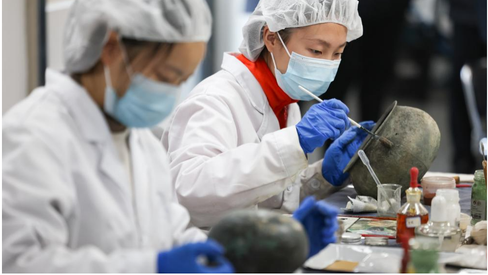 12月16日,三星堆研究院工作人员在修复青铜文物(图源:新华网)
