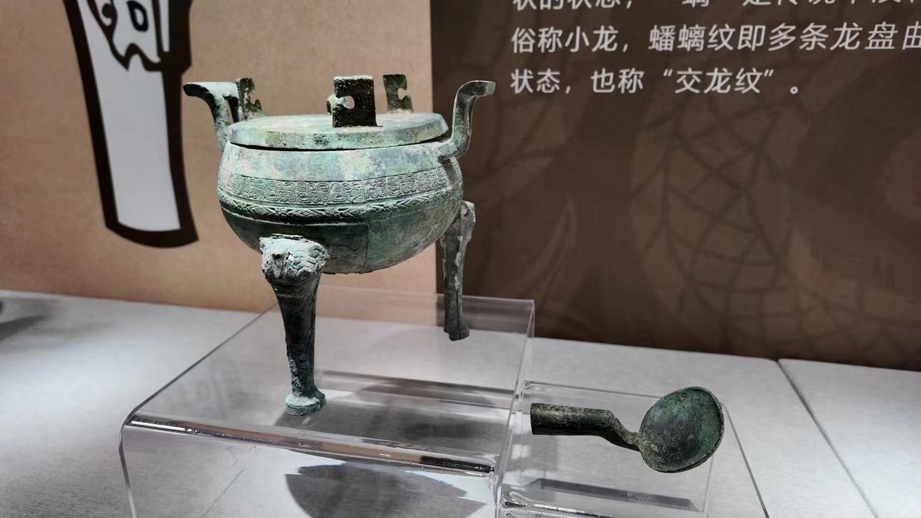 除此之外,展览还采用“文物组合”展览模式,将关联文物集中展示,让文物自己讲述背后的故事。何新华介绍:“这是1990年怀柔一中科技楼出土的2000多年前的青铜鼎,在古代相当于现在的‘小火锅’,这次我们特意将同时期出土的青铜勺一同展出,配合讲解,观众一看就能明白铜鼎和铜勺是一起使用的,既可以用于宴饮,也可以用于祭祀。”