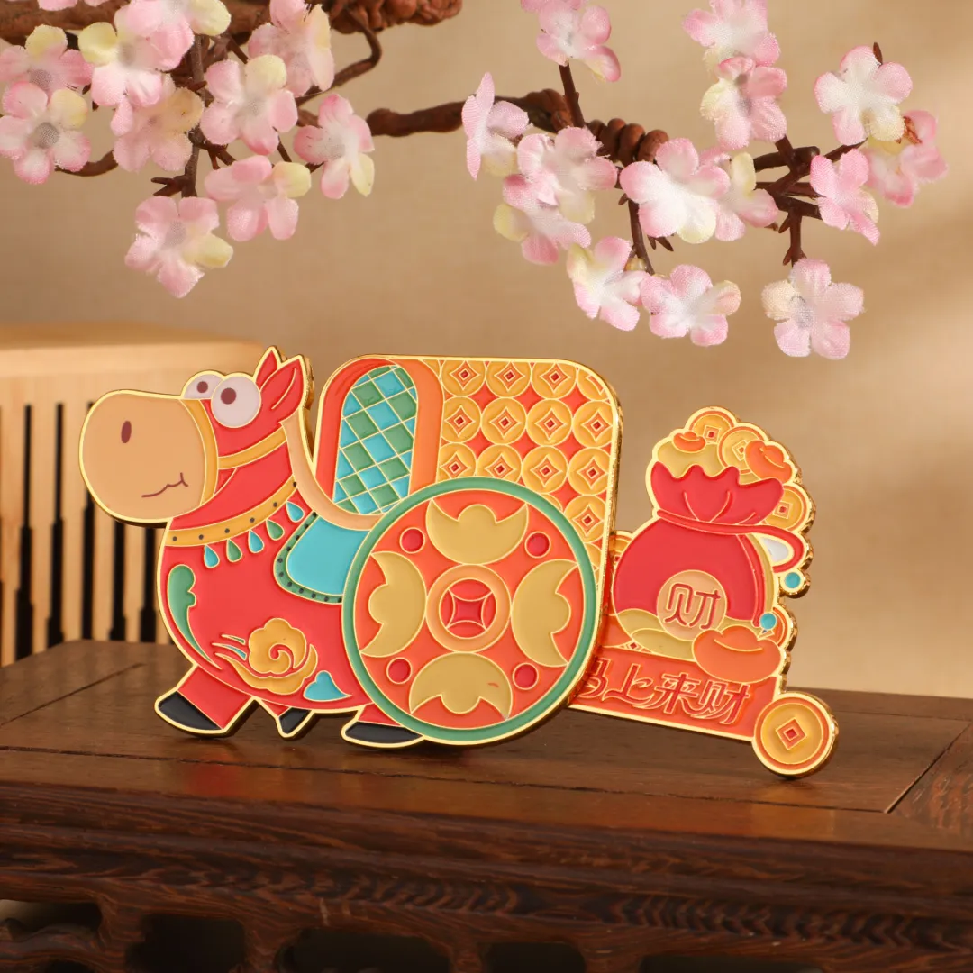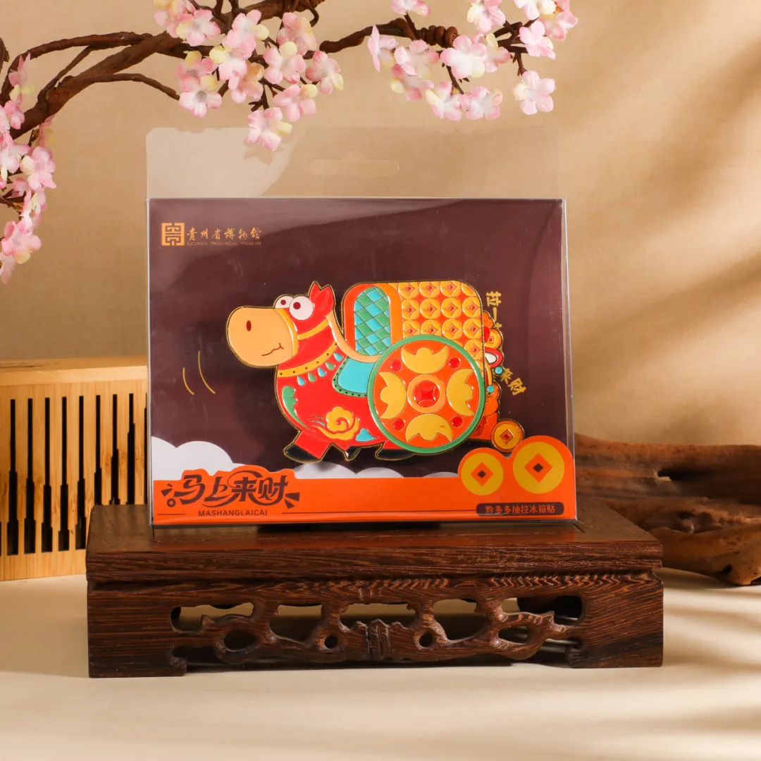 “马上来财”,新年最讨喜的祝福之一。这款“黔多多”抽拉冰箱贴,以贵博镇馆之宝东汉铜车马为灵感,将千年文物化作萌趣十足的“马上来财”。它以鲜亮的红金配色复刻铜车马造型,Q版小马憨态可掬,车厢饰以铜钱纹与如意云纹,满载吉祥寓意。巧妙的抽拉设计,让车厢后部可灵活抽出,露出福袋与元宝图案,指尖轻动间,文物的厚重底蕴与新年的喜庆氛围巧妙融合。