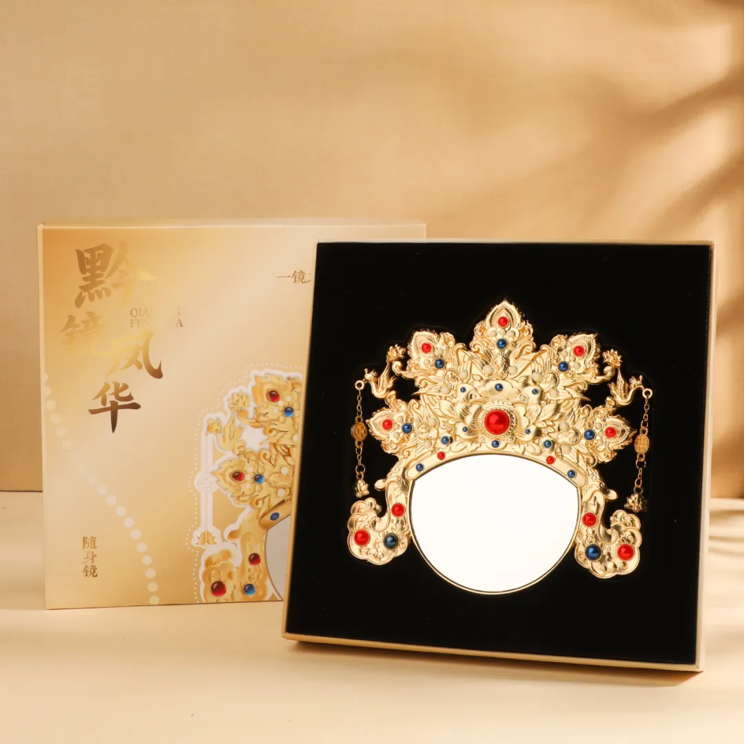 当文物走出展厅,化作可以触摸、可以把玩、可以品尝的日常好物,文化便不再只是陈列在橱窗里的存在,而是在生活的细把明代凤冠握在掌心的东方美学——黔镜凤华随身镜,以金镶宝五凤冠为灵感,提取凤鸟、宝石等核心元素,用锌合金复刻出立体华美的冠饰轮廓,红、蓝、白三色仿宝石点缀其间,还原文物的华贵质感。 镜面清晰,尺寸适中,便携实用。每一处錾刻与镶嵌,都在还原明代金器工艺的匠心。自用是随身的美学点缀,送礼是饱含文化底蕴的心意之选,华贵之美触手可及。 微处悄然延续。这个春节,不妨为家中添一件有故事有年味儿的贵博文创产品,为朋友准备一份带着贵州气息的心意,也为自己留下一段与历史轻声对话的时光。 贵博文创,让文物在新年里焕发新的光彩。