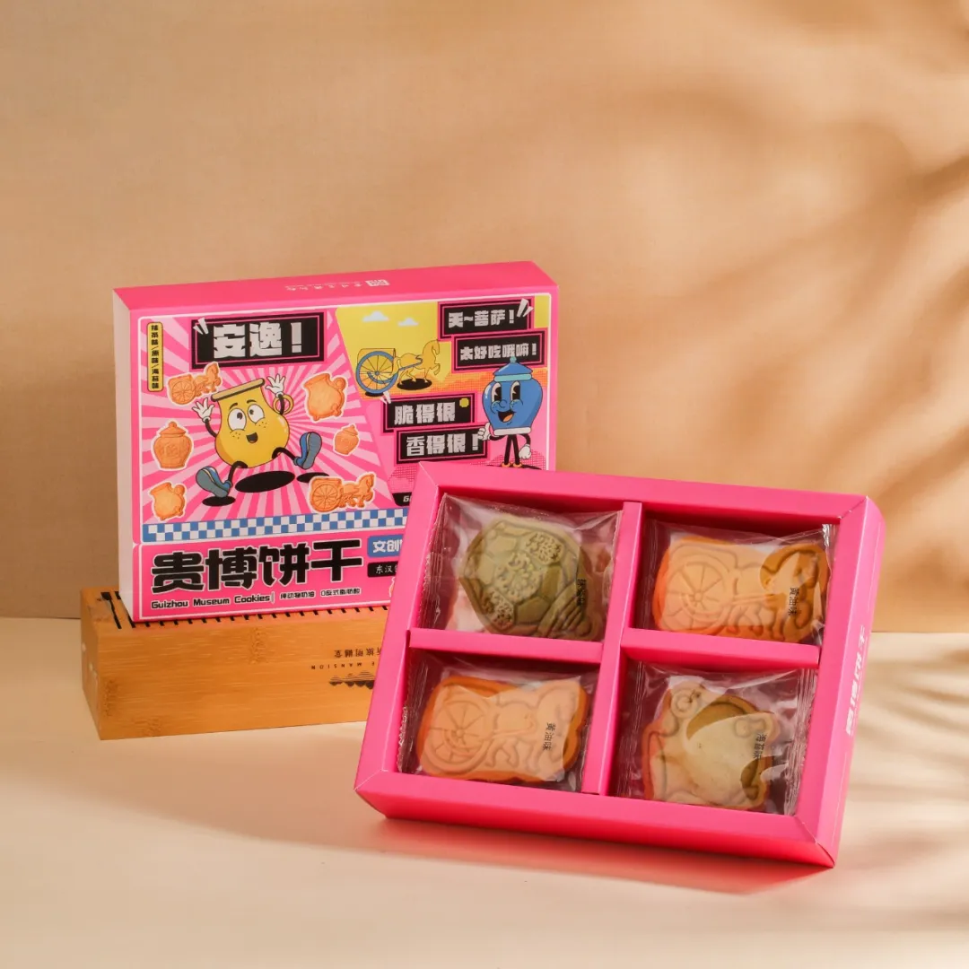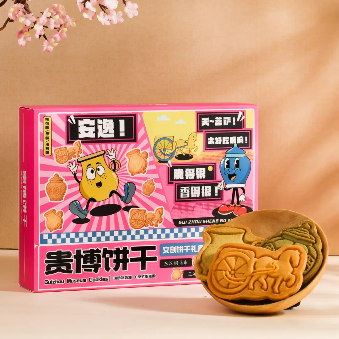 除了好看、好玩,年货当然也得好吃。贵博文创饼干,以东汉铜车马、黔府青花罐、鎏金三足铜鍪为原型,将千年文物的厚重底蕴,化作舌尖上的趣味体验。抹茶味、海苔味、原味三款口味,分别对应三款文物造型,每一块饼干都复刻了文物的独特轮廓与纹饰。包装以明快的粉色为底,文物化身活泼卡通形象,搭配“安逸!”“天菩萨!”等贵州方言,不仅是一份美味的零食,更是一次可品尝的贵州文化之旅,走进日常,治愈味蕾。