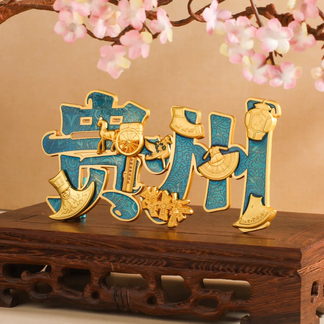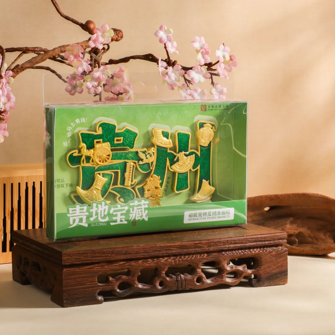 一枚冰箱贴,也可以成为一场“小型展览”。这款“贵州”主题文创冰箱贴,以“贵州”二字为框架,将贵博多款代表性文物融于方寸之间。翠绿底色和墨绿色底色衬以传统纹样,浮雕工艺立体呈现东汉铜车马、北宋韩琦楷书信札卷、鹭鸟纹蜡染衣裙、黔府青花罐等八件瑰宝。铜车马可滑动,文物图案组件能转动,不仅是一枚承载着贵州文化记忆的冰箱贴,更是一件可玩可赏的“移动博物馆”,让厚重的历史在日常中触手可及。