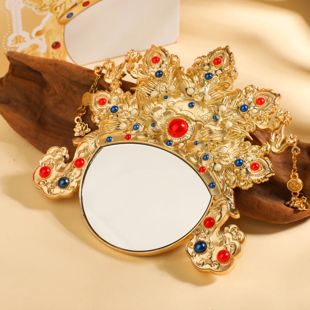 把明代凤冠握在掌心的东方美学——黔镜凤华随身镜,以金镶宝五凤冠为灵感,提取凤鸟、宝石等核心元素,用锌合金复刻出立体华美的冠饰轮廓,红、蓝、白三色仿宝石点缀其间,还原文物的华贵质感。 镜面清晰,尺寸适中,便携实用。每一处錾刻与镶嵌,都在还原明代金器工艺的匠心。自用是随身的美学点缀,送礼是饱含文化底蕴的心意之选,华贵之美触手可及。