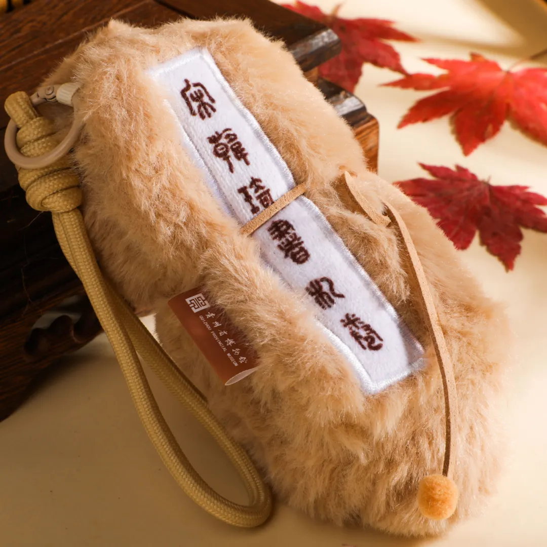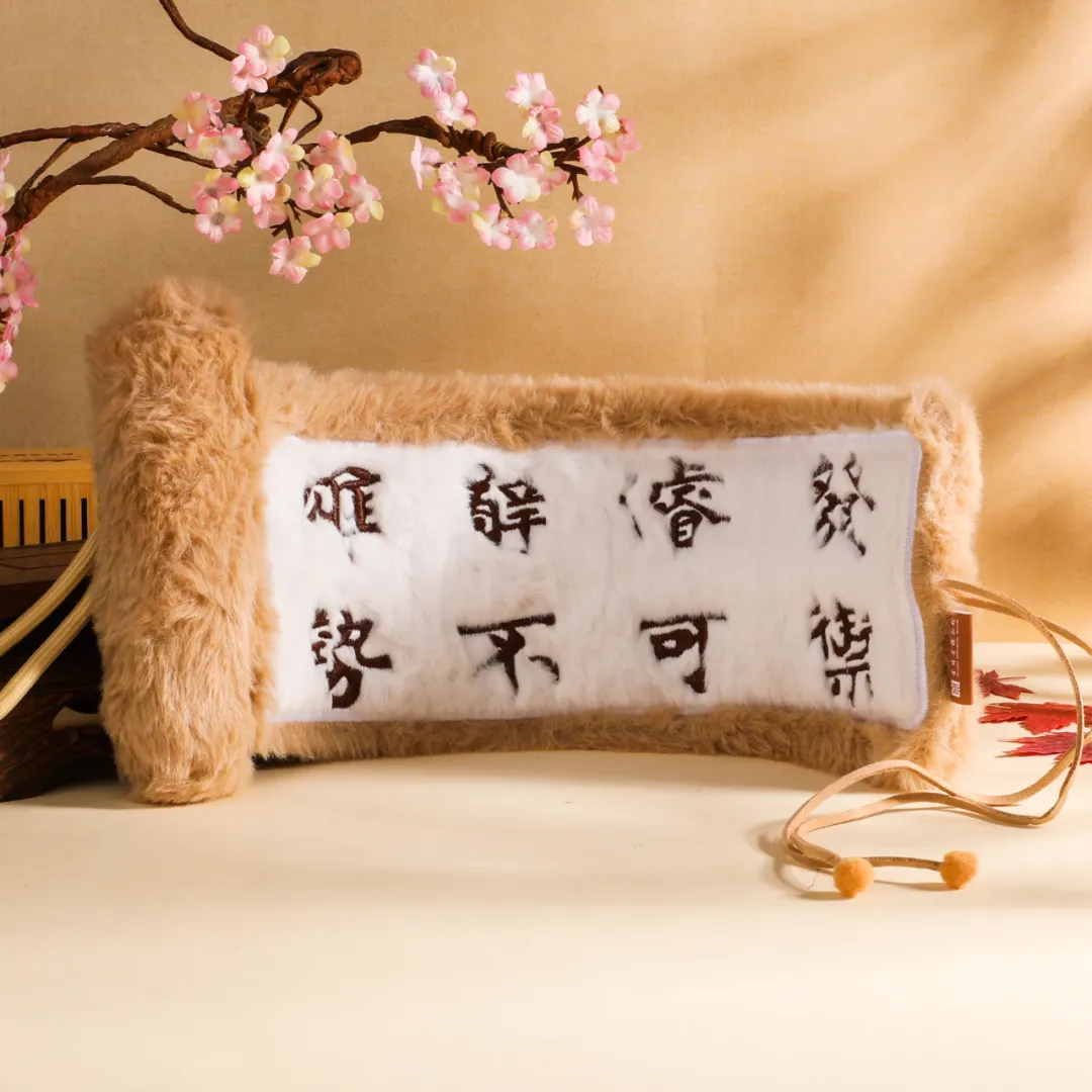 灵感源自《北宋韩琦楷书信札卷》,把它做成毛绒卷轴挂饰,将千年墨韵与柔软触感巧妙融合。原本只能在展柜里看到的书卷气,现在变成了可以触摸、可以随身佩戴的小挂饰。封面绣有“宋韩琦信札卷”字样,还原文物的古朴质感。展开后可见信札中的经典文句,让千年文脉与书法在掌心可触可感。浅棕毛绒搭配米白绣带,既保留了宋代文人的雅致风骨,又增添了现代文创的治愈温度。